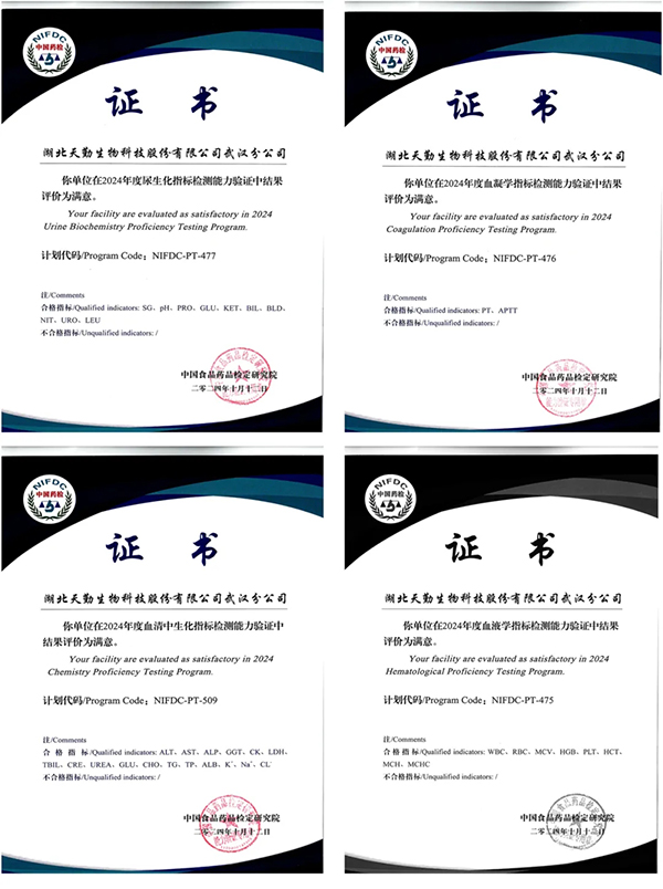 在血清中生化指標(biāo)(NIFDC-PT-509)、血液學(xué)指標(biāo)(NIFDC-PT-475)、血凝學(xué)指標(biāo)(NIFDC-PT-476)和尿生化指標(biāo)(NIFDC-PT-477)四個(gè)關(guān)鍵項(xiàng)目的能力驗(yàn)證過(guò)程中,天勤生物武漢分公司提交了全部37個(gè)能力驗(yàn)證指標(biāo),且所有項(xiàng)目均以滿分100分通過(guò),最終獲得“滿意”的最高等級(jí)認(rèn)定。在臨床檢驗(yàn)領(lǐng)域,天勤生物武漢公司不僅配備了先進(jìn)的儀器設(shè)備,還建立了完善的實(shí)驗(yàn)室質(zhì)量控制體系,并擁有一支高技能的專業(yè)團(tuán)隊(duì),這一系列優(yōu)異的成績(jī)充分展示了天勤生物武漢分公司在臨床檢驗(yàn)領(lǐng)域的扎實(shí)功底。