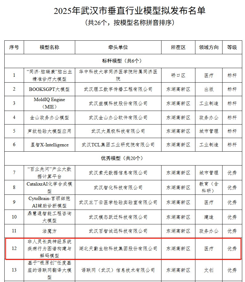 天勤生物行為圖譜解碼模型入選2025武漢市優秀垂直模型