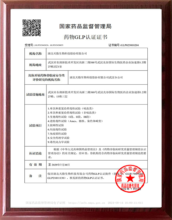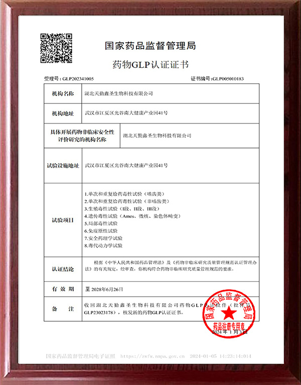 湖北天勤生物武漢分公司(安全性評價中心)是湖北省第一家民營GLP研究機構,現有一支近300人的專業技術團隊,具備了開展中國NMPA、美國FDA項目的質量管理體系和資質,同時通過了國際AAALAC完全認證。公司目前擁有超過10000m2 的設施,可開展嚙齒類和非嚙齒類的單次給藥、重復給藥、生殖【大鼠I、II和III段;小鼠I、II和III段;兔II和兔III段;伴隨食蟹猴(性成熟)重復給藥毒性試驗的生育力評價研究、食蟹猴伴隨胎盤屏障和血乳屏障的EFD試驗和增強的圍產期發育(ePPND)毒性試驗】、遺傳毒性(Ames、微核和染色體畸變)、免疫原性、安全藥理、局部刺激、毒代動力學和致癌等9項GLP試驗以及藥效、藥代動力學、毒性探索性試驗(DRF)等,尤其在生物制品、化藥和中藥和兒科用藥等方面擁有大量的非臨床評價經驗和成功案例,同時在上述藥物的生殖與發育毒性試驗設計、結果判定等方面積累了寶貴的經驗;建立了國內領先的食蟹猴生殖毒性與發育毒性研究平臺,是國家科技部重大新藥創制科技重大專項的藥物安全性評價示范平臺之一。